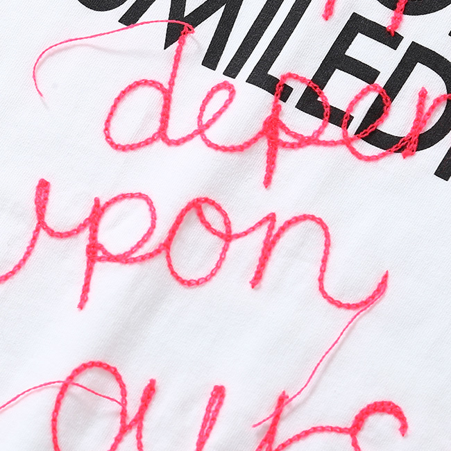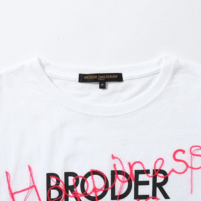 Broderロゴプリントの上にハンドル刺繍を施したビッグシルエットTシャツ。白にはオレンジ、黒には蛍光イエローの糸で刺繍を施しています。