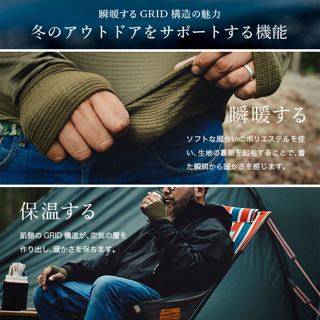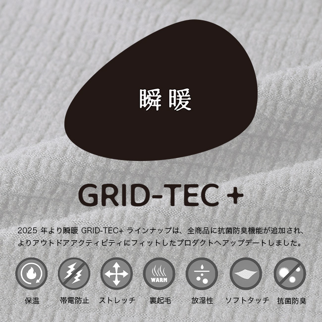 瞬暖GRID-TEC+は、肌に触れる面を起毛したGRID構造にすることで、体温を閉じ込め、着た瞬間から暖かさが実感できます。GRID構造は、体とインナーの間に暖かい空気の層を形成し、保温性を最大化しています。