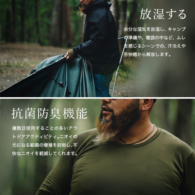 同時に、余分な湿気を放湿し、キャンプの準備や寝袋の中など、ムレを感じるシーンでの汗冷えや不快感から解放します。