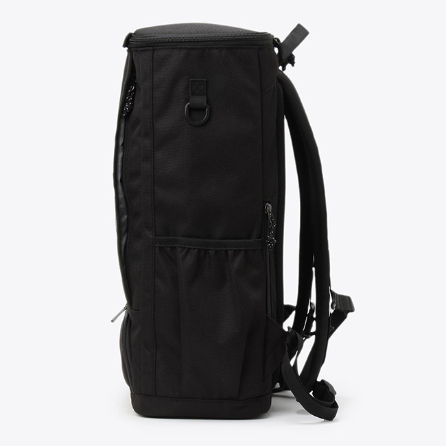 両サイドにはボトル収納用のストレッチポケットとDカンを備え、引手コードには視認性を高めるリフレクターも採用されています。