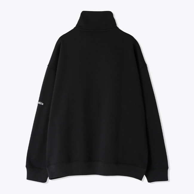 襟元はハーフジップ仕様で脱ぎ着がし易く、リブの入った袖口、両側ポケットやさりげなく配置したブランドロゴが特徴的。