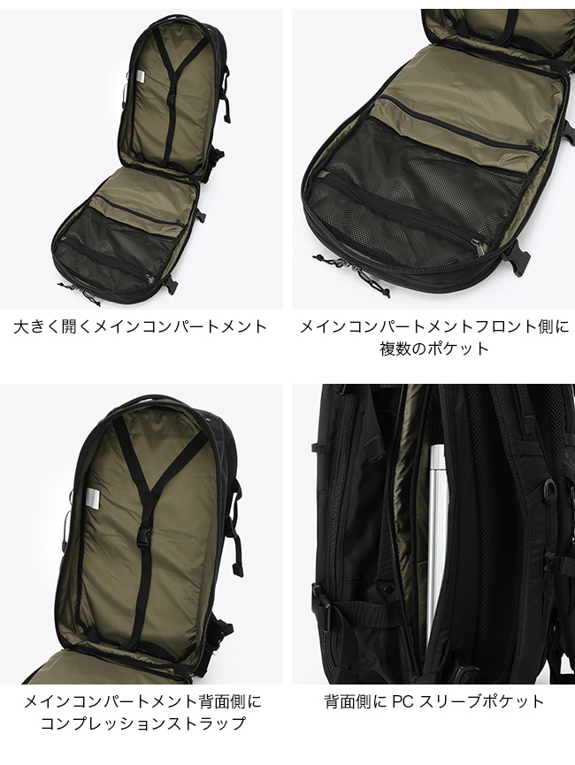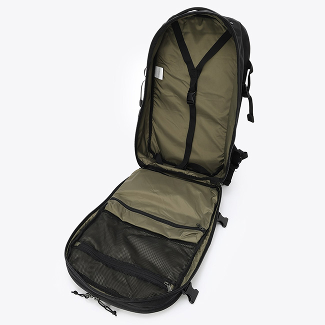 メインコンパートメントには、大きなメッシュファスナーポケットとクッション入りポケット、縦型コンプレッションストラップを装備し、収納力と整理力を両立。