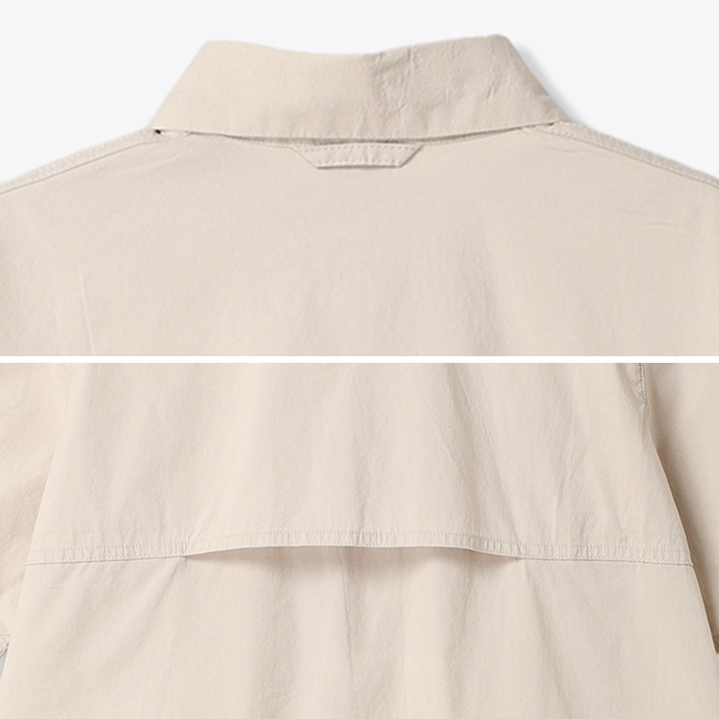 コンパクトな丈感とゆったりとしたボックスシルエットで、アウトドアにも日常にも取り入れやすいカジュアルなデザインに仕上げています。素材にはコットンとナイロンをベースにポリウレタンを混紡したミッドウェイトプレーンウィーブ生地を採用し、軽やかさと程よいハリ感、ストレッチ性を兼ね備えた快適な着用感を実現。