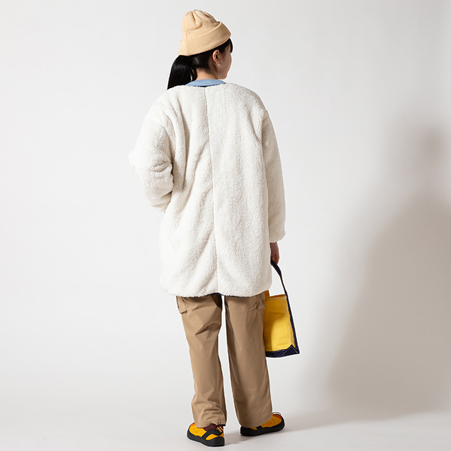 エルモフリースを表にすると季節感のある装いを楽しめ、裏にするとふんわり包み込まれるような温かみを感じられます。