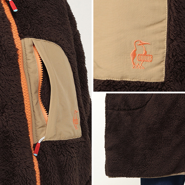 表地にはふわふわの優しい肌触りが魅力のCHUMS定番のエルモフリース、裏地にはナイロン素材を使用。