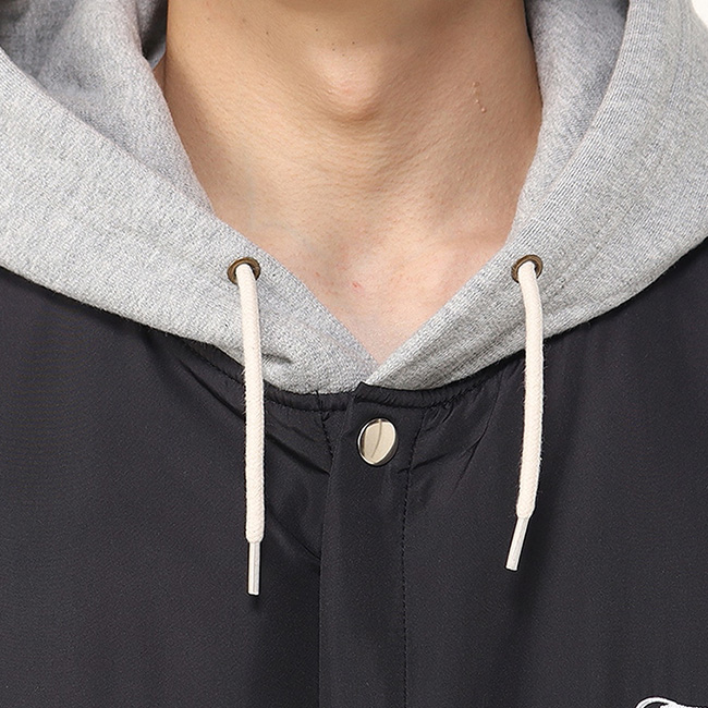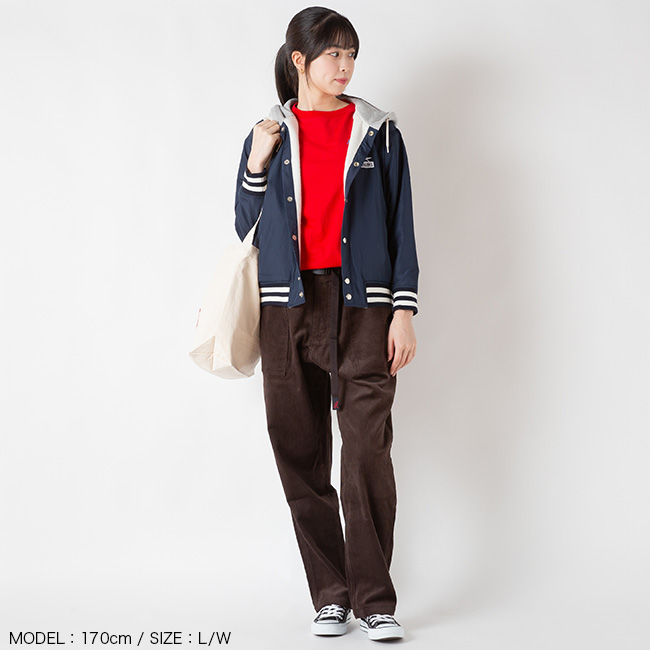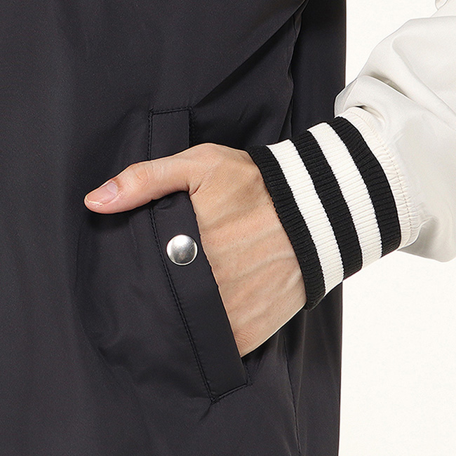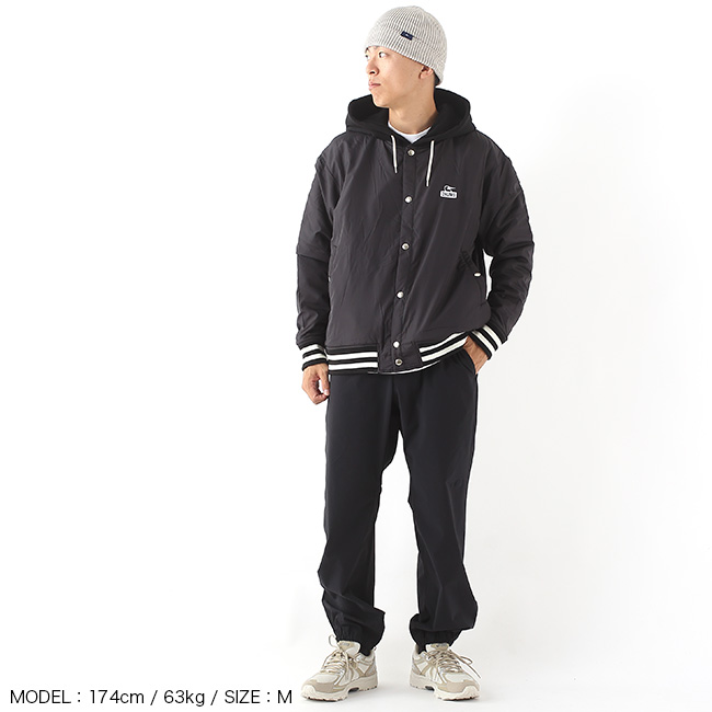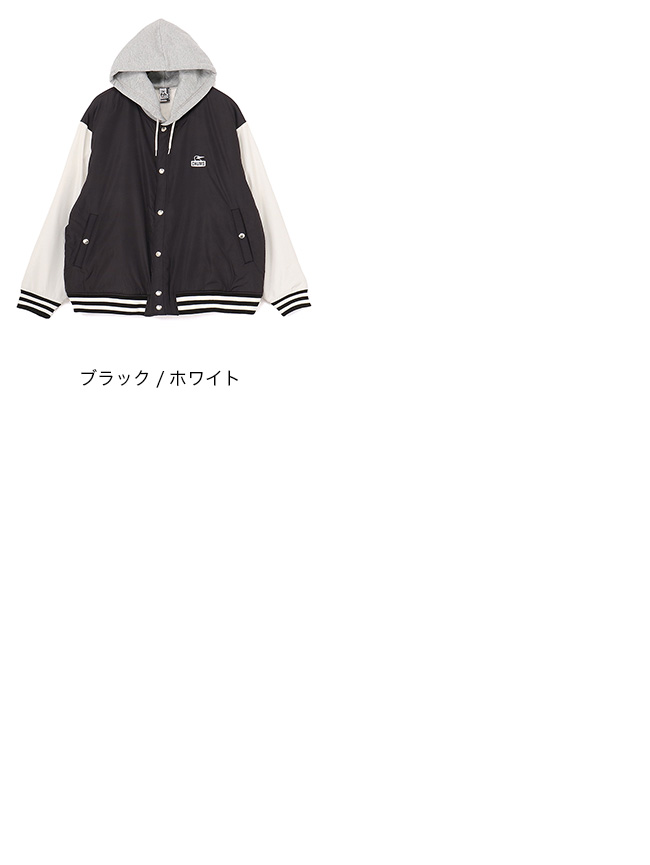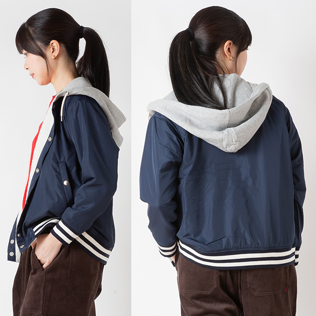 スタジャンとパーカーの重ね着風デザインで、着こなしテクいらずでコーディネートが完成します。