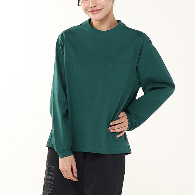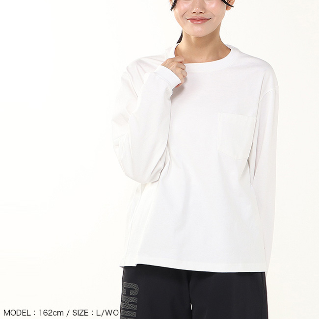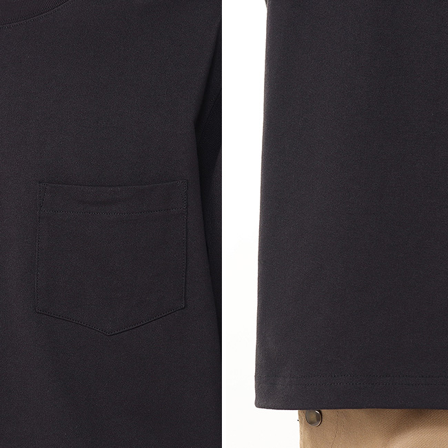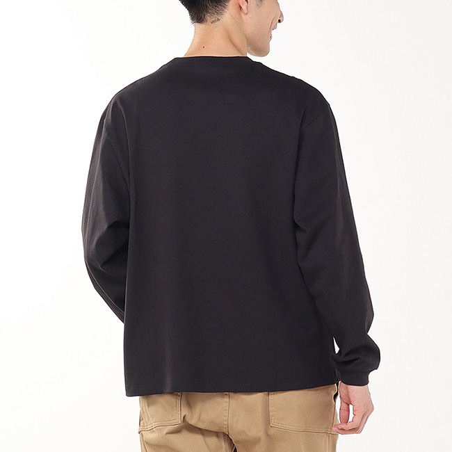 ゆったりしたオーバーサイズシルエットのポケット付きロングスリーブTシャツ。左胸にポケット、左サイドにはピスネームを配置。