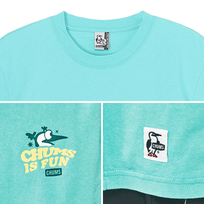 CHUMSアイテムをアレンジして組み合わせたバックプリントがレトロポップな雰囲気があり単色のデザインなので着やすくなっています。フロントはワンポイントでCHUMS is FUNとブービーバードを組み合わせてシンプルかつ可愛く仕上げています。