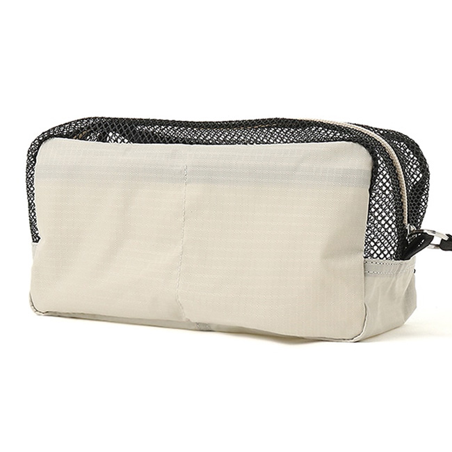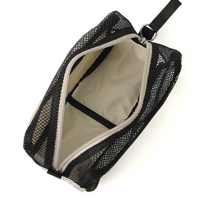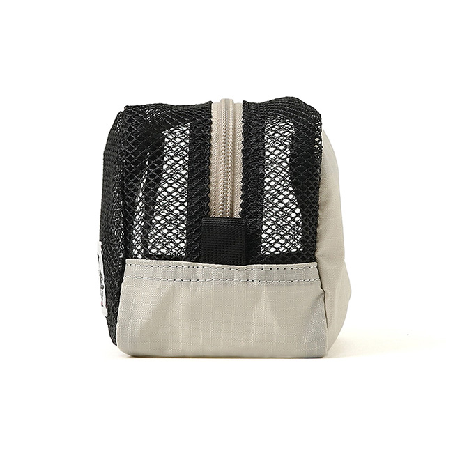 ポリエステルメッシュ素材をボディに使用。水はけが良く、何が入っているか一目瞭然のデザインで、ウォータースポーツやアウトドアの小物の持ち運びに活躍します。