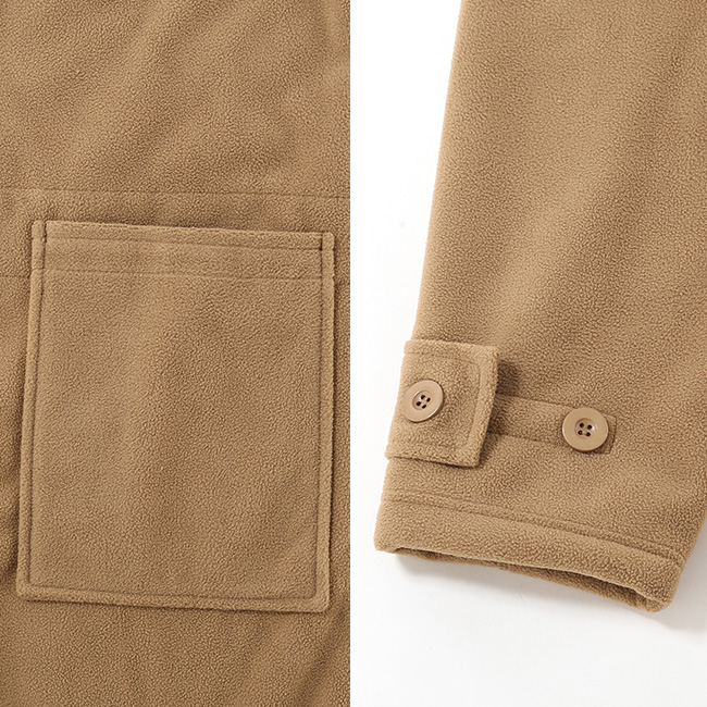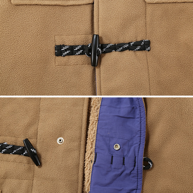 裏地が毛足の短いマイクロフリースなので、防風性、保温性を保ち、着心地も抜群。毛足の短い面のフリースを表側に使用し、フリースながらもダッフルコートらしい表情にしています。