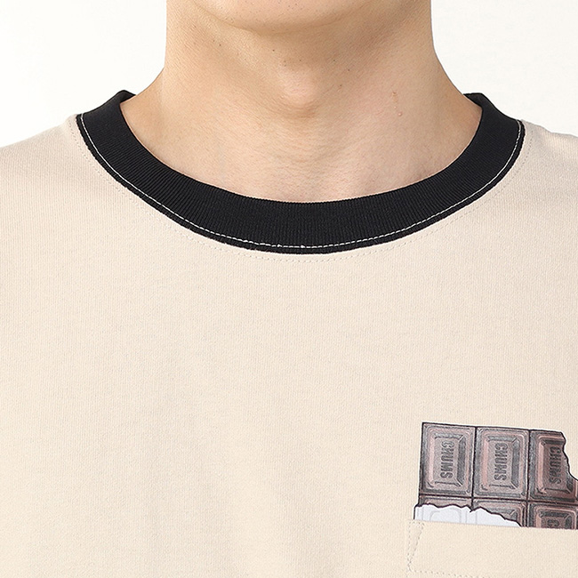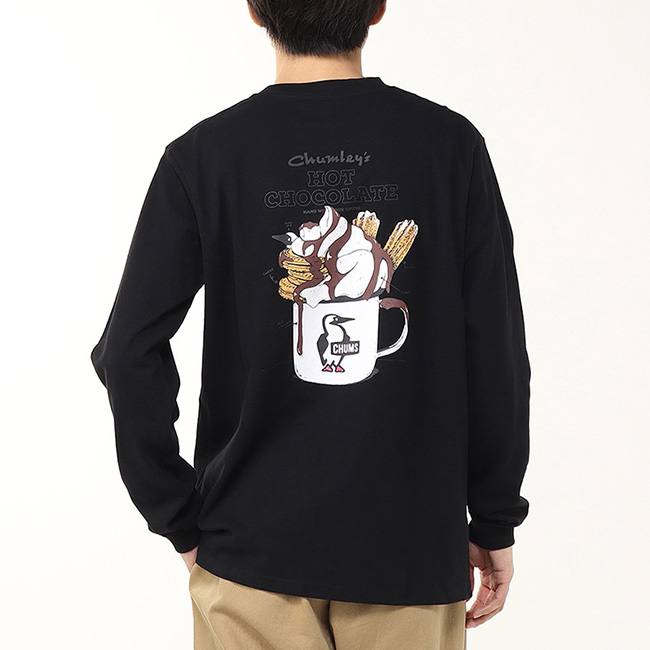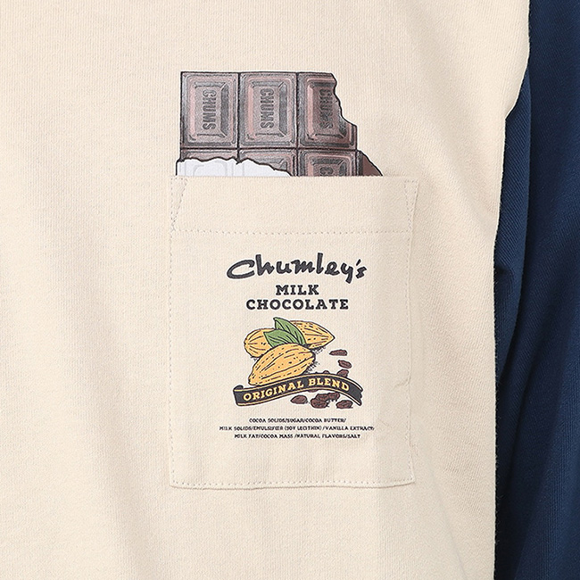 左胸ポケットはチョコレートのパッケージ風にデザインし、背面にはCHUMSのマグカップにたっぷりと盛り付けられた贅沢なホットチョコレートを大胆にプリント。