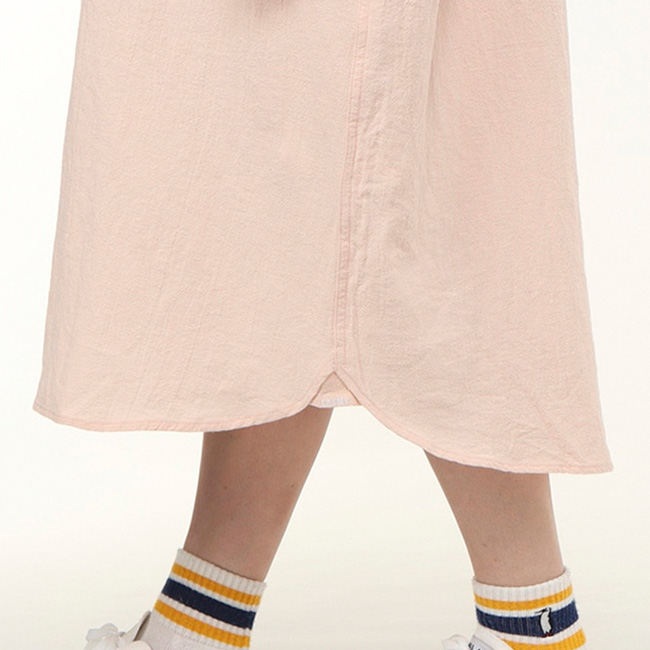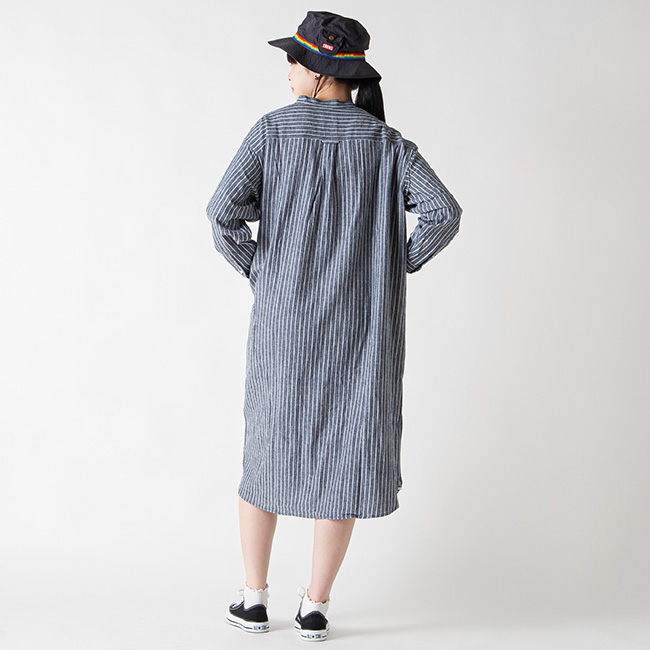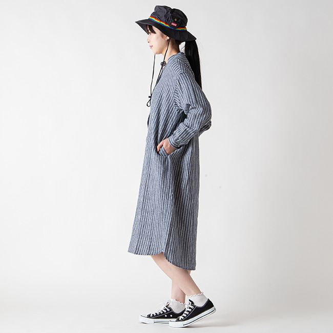 安心感のある膝下丈で、ワンピースとしてはもちろん、ボタンを開けて羽織ったり、パンツとレイヤードしたり、様々な着こなしを楽しめます。