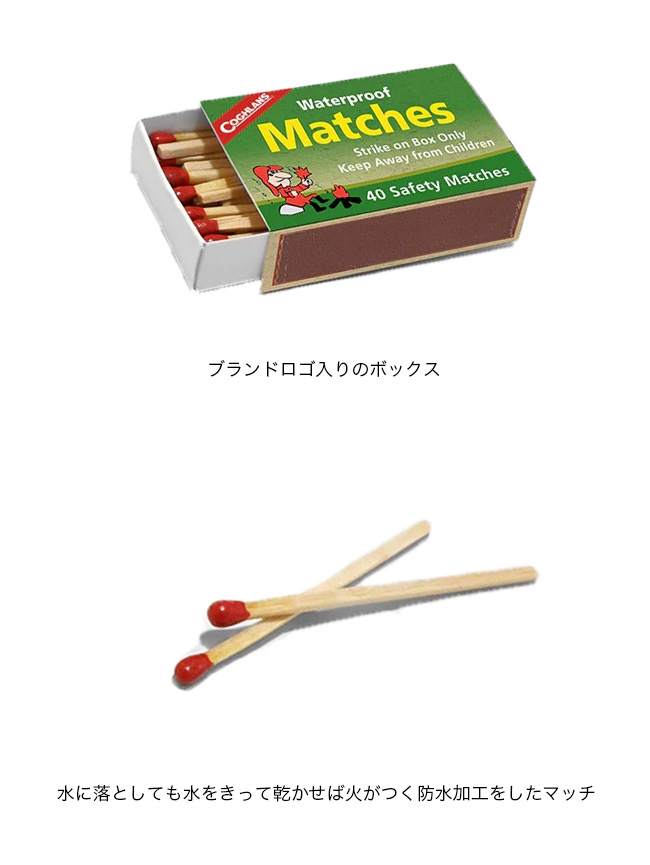 OGHLANS コフラン 防水マッチ 4個セットは水に落としても水をきって乾かせば火がつく防水加工をしたマッチです。タックルボックス、バックパック、車に必ず入れておきたいマッチです。