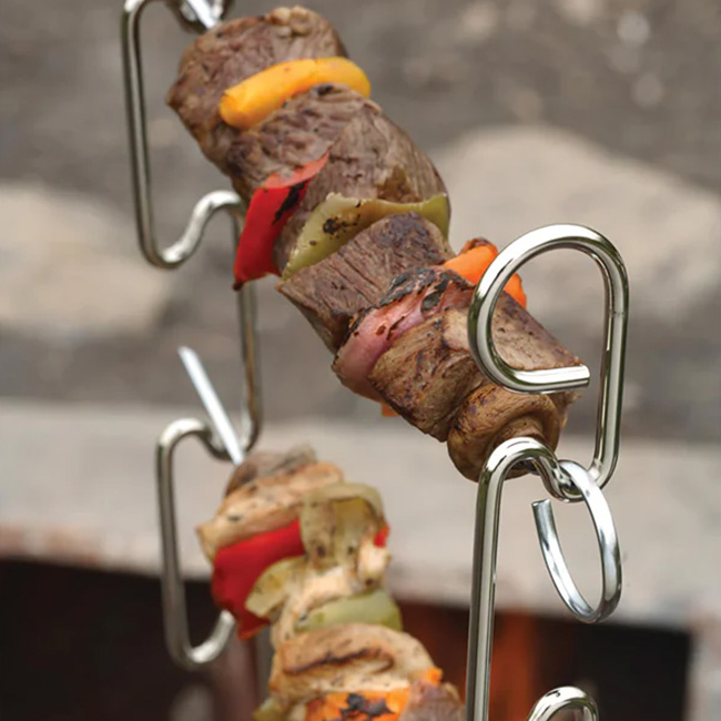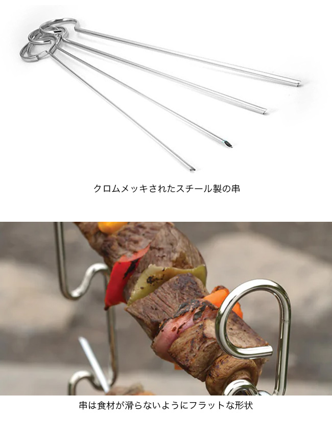 COGHLANS コフラン 焼き串 12インチ 4パックはクロムメッキされたスチール製の串です。串は食材が滑らないようにフラットな形状で、シーズニングをたっぷりと塗ったお肉を刺して焼いたり、釣りあげた魚をじっくりと熾火でカリカリとした塩焼きにするのに非常に便利です。