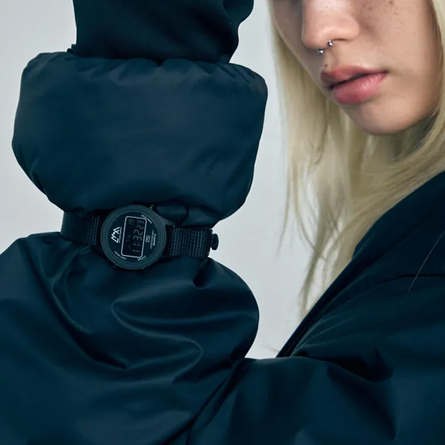 A digital watch produced in collaboration with VAGUE WATCH. The design has been adapted to include a Fidlock buckle for the strap,and the movement has been changed from quartz to digital to suit the new design.
