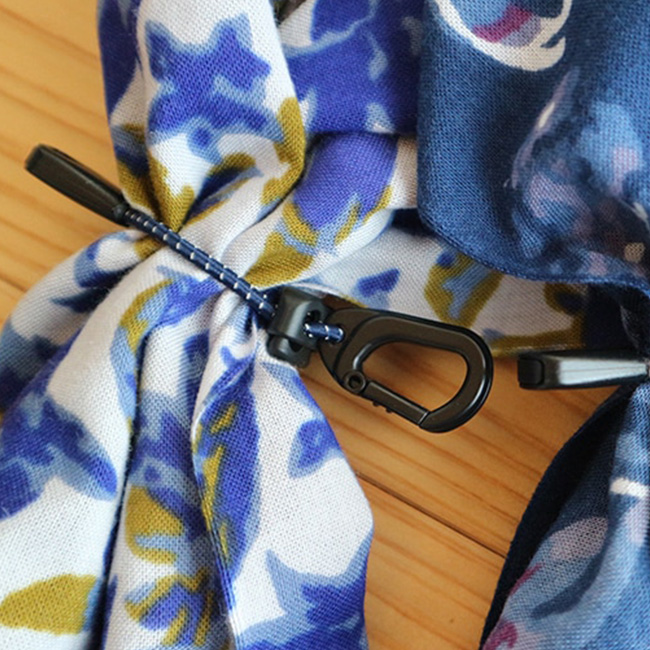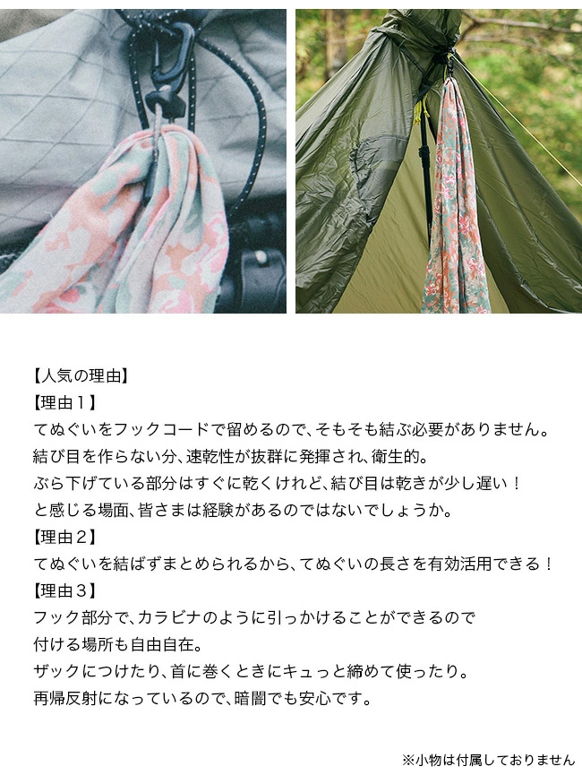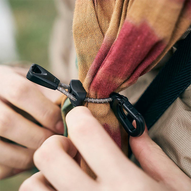 アウトドアでも日常でも、てぬぐいをスマートに持ち歩けるアイテムです。結ばずに使えるため、てぬぐい本来の長さをそのまま活かせます。