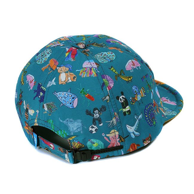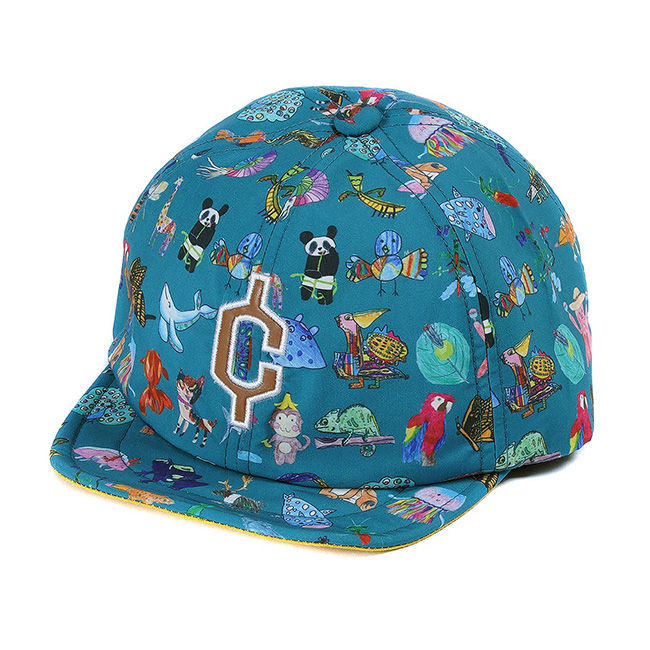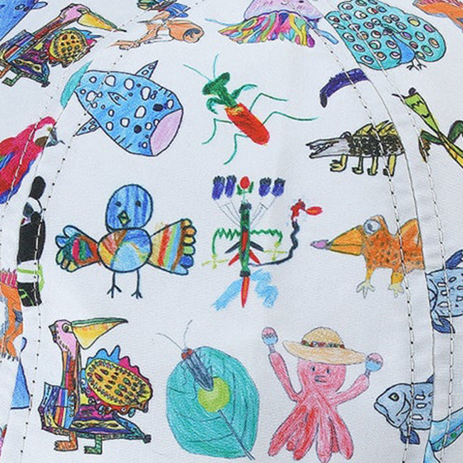 子どもたちの柔らかな優しい、元気いっぱいのタッチで描かれた自由なイラストがとっても楽しい総柄の帽子が完成しました。