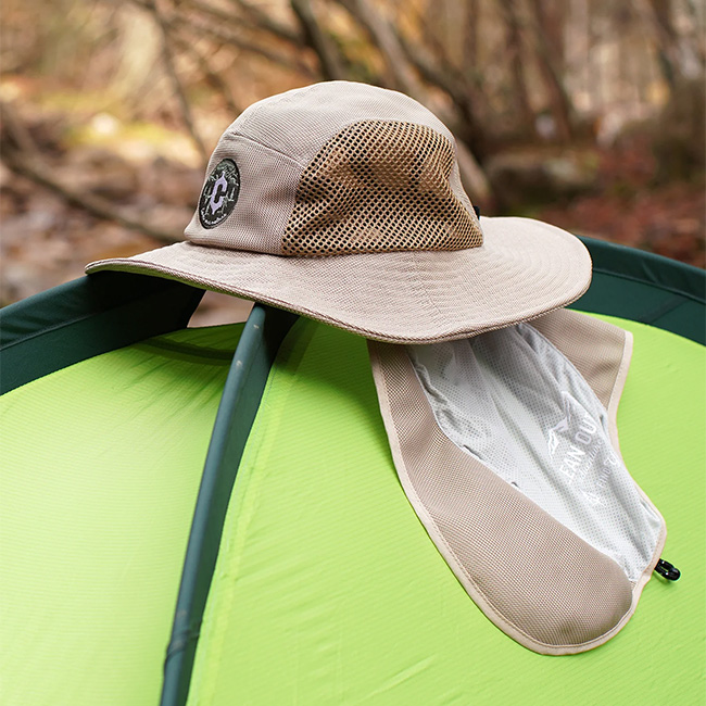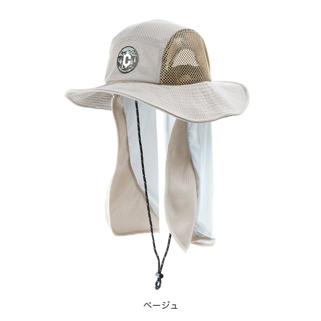 肩までしっかりと覆う事ができる大きなシェードは「 接触冷感 」素材を採用し、首元からひんやりとした肌触りと気持ちよさ。帽子本体の生地もメッシュや通気性の高い素材を採用し、帽子内の熱を効率よく発散します。