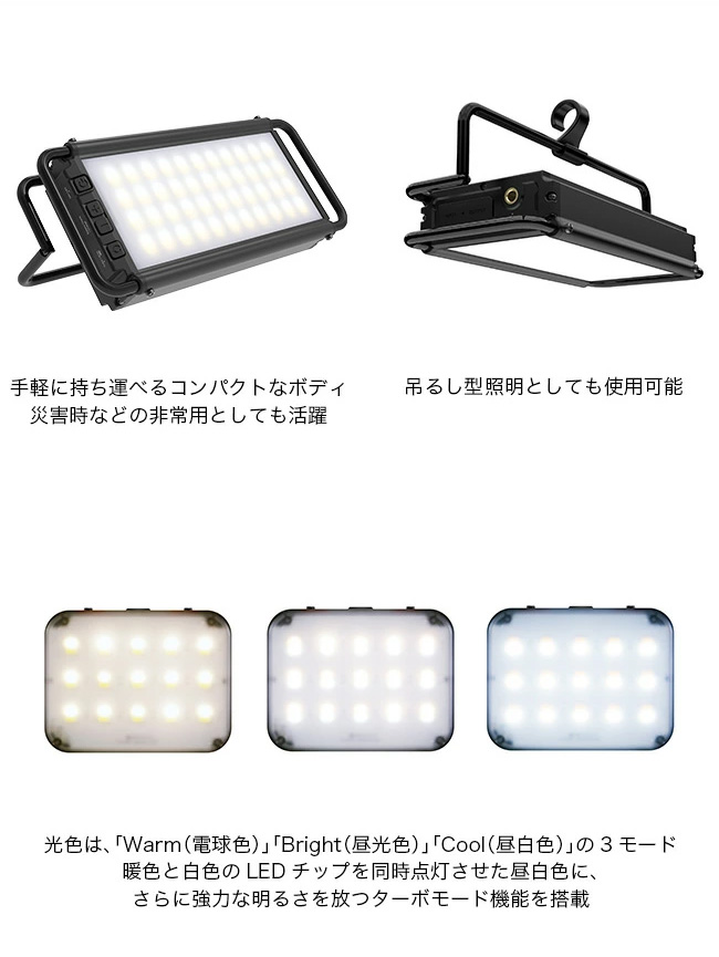 3つの光色はそれぞれ明るさも調節でき、例えば、テントの中で語らう時には「Warm」を好みの明るさに。