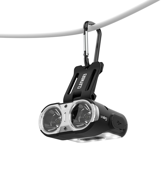 本体のクリップを帽子のツバなどに差し込むだけでキャップライトとして手軽に使えるほか、本体に付属のカラビナフックをかければ吊るし型照明としても使える便利さを兼ね備えています。
