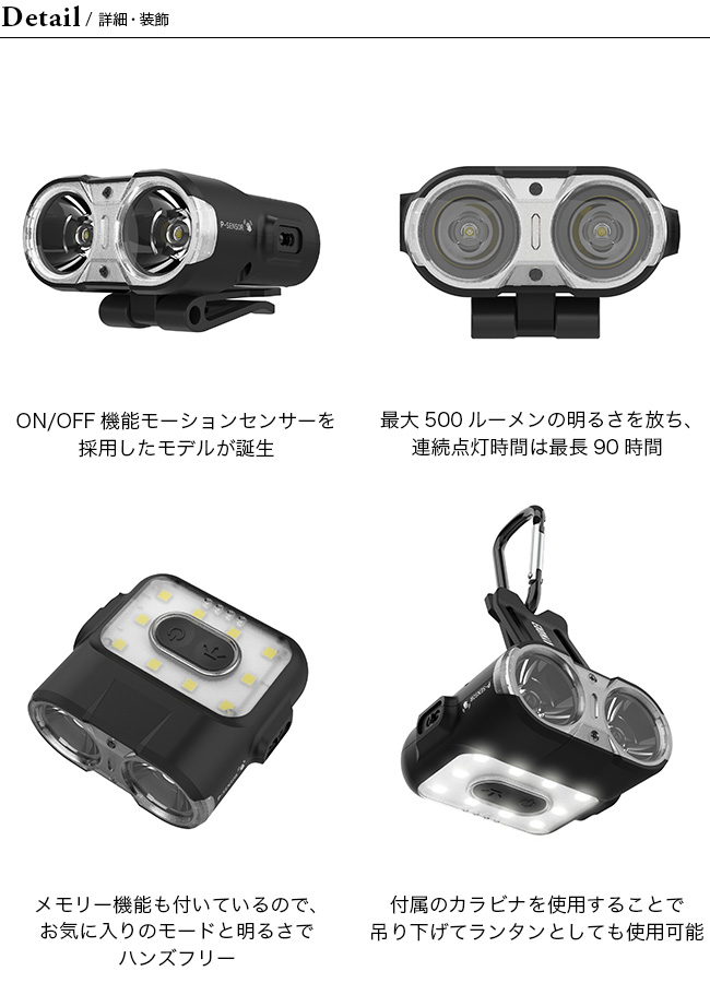 帽子やヘルメットにクリップを差し込んでヘッドライトの代わりにしたり、付属のカラビナを使用することで吊り下げてランタンとしても使用可能。