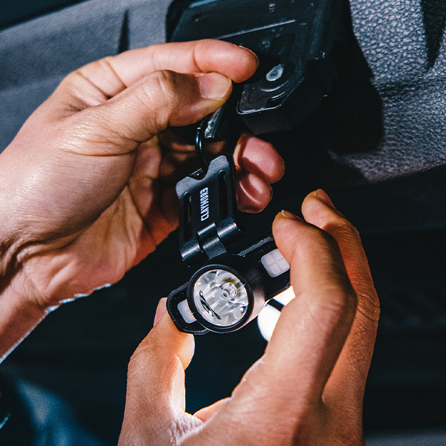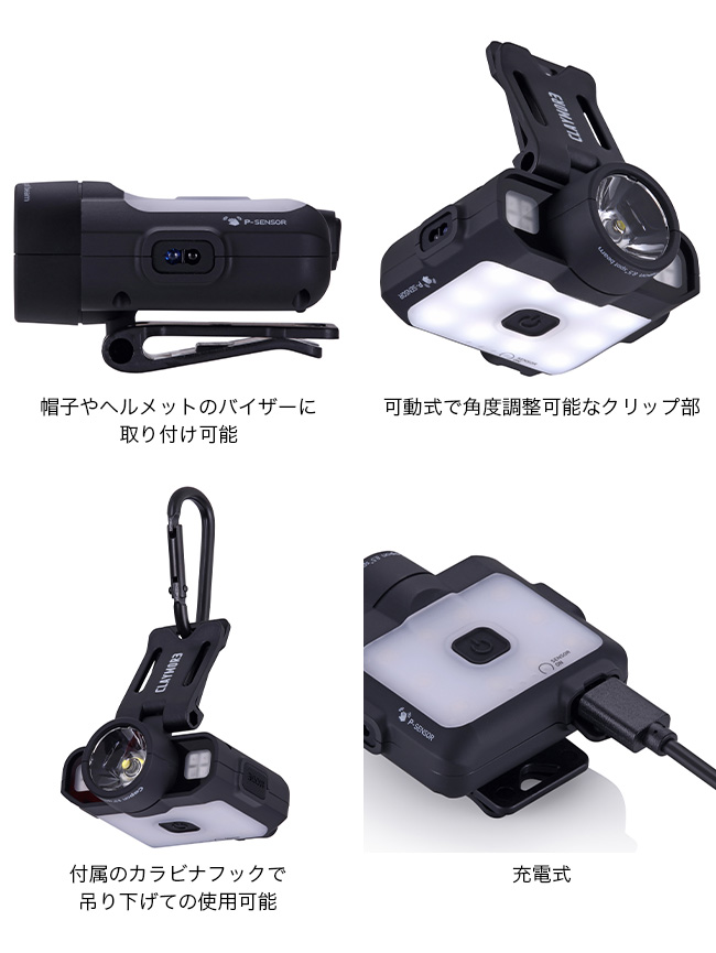 帽子やヘルメットのバイザーに取り付けられるほか、付属のカラビナフックを使えばランタンとして吊り下げることもできます。