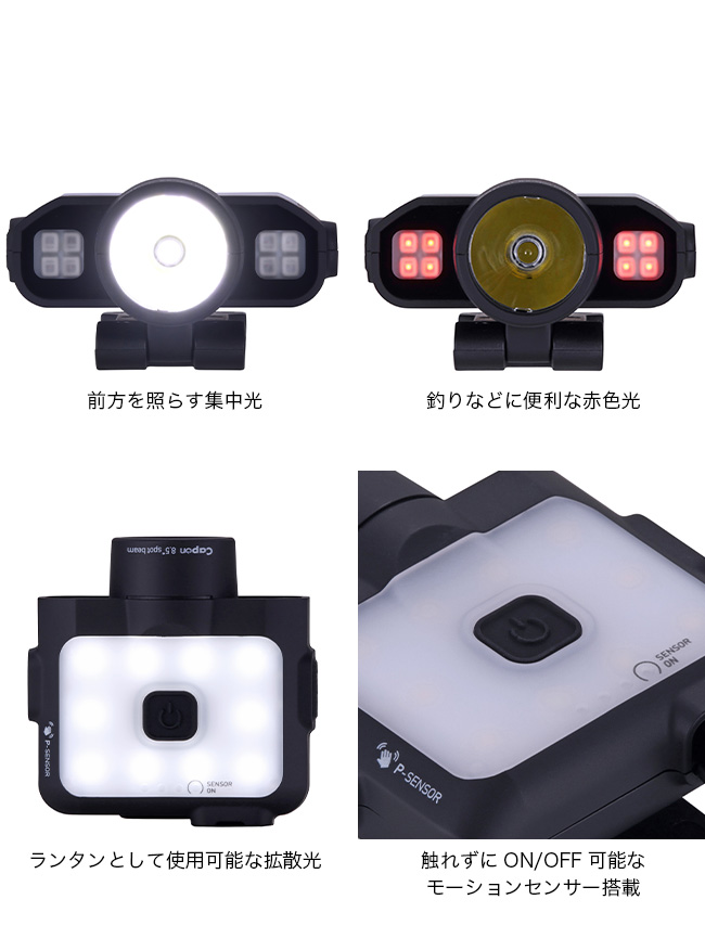 前方を照らす集中光の他に、ランタンとして使用可能な拡散光、釣りなどに便利な赤色光を切り替え可能。