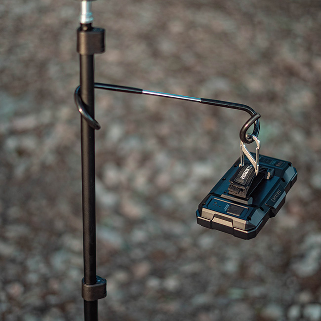 付属の専用スタンドやお手持ちのカラビナを使えば、設置・吊り下げ・持ち運びも自由自在。