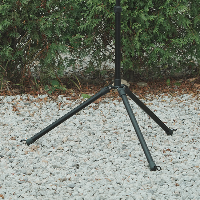 ワンアクションで足の折りたたみができ、フリップロックシステムによりスムーズに高さ調節が可能。足の先端には地面に固定するためのぺグループが付属。