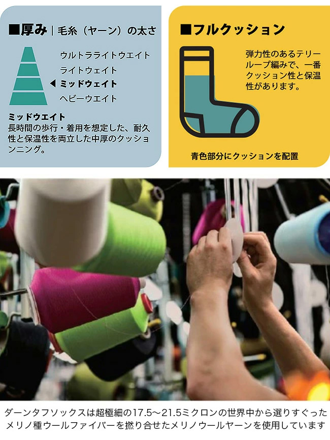 ■お手入れ方法:ダーンタフソックスを長持ちさせるために、ソックスを裏返して、液温40℃を限度とし、洗濯機で弱水流で洗ってください。