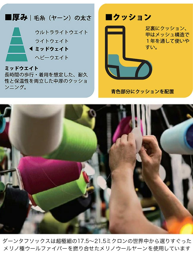 メリノウールをDARN TOUGH VERMONTソックス独自のニッティング技術により密度の高く弾力性のあるループ編みにより高いクッション性で衝撃を吸収します。