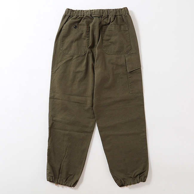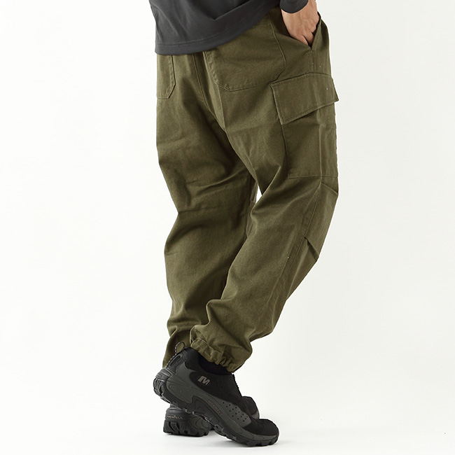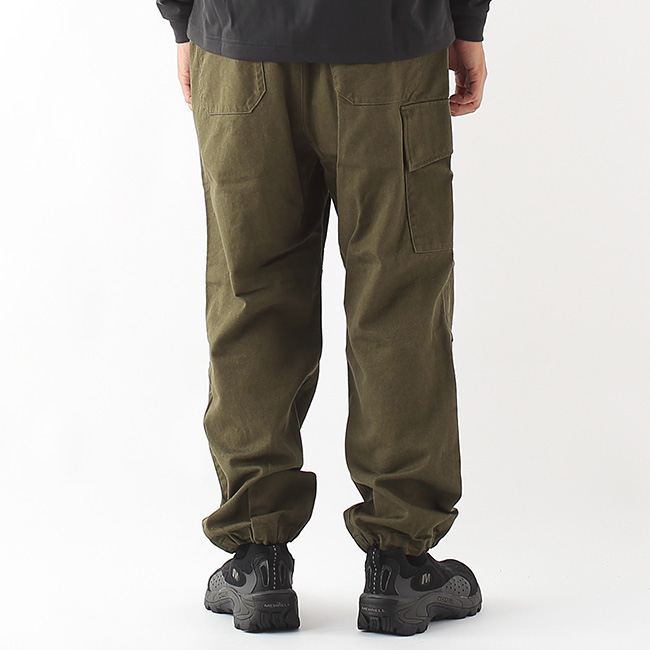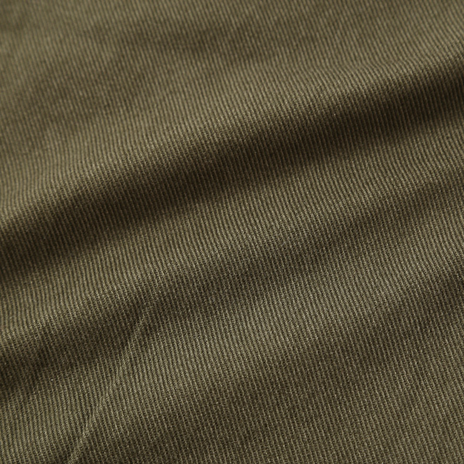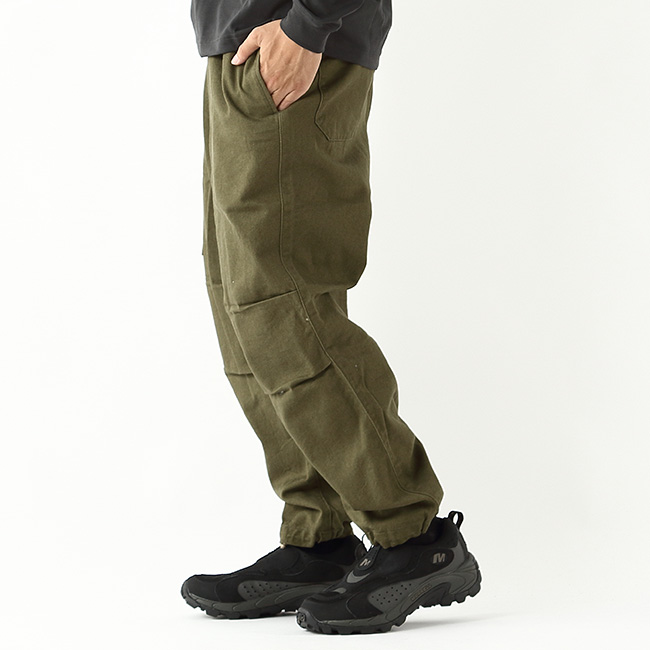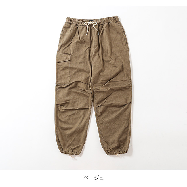 色合いも含め自然で表情のある見え方が特徴。ミリタリーテイストながら程よいワイドシルエットとシンプルなディティールで品の良いコーディネートが可能なパンツ。