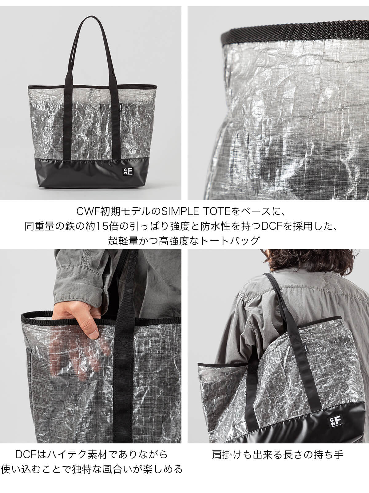 CWFのファーストラインナップでもあったSIMPLE TOTEをベースに、マテリアルをドベルグらしいダイニーマ・コンポジット・ファブリック(通称DCF)に置き換えたことで、前代未聞な超軽量でありながら高強度なトートバッグが誕生しました。DCFは同重量の鉄の15倍ものひっぱり強度を持つ強靭な素材で、その防水性と軽さからULハイカーに重宝されています。