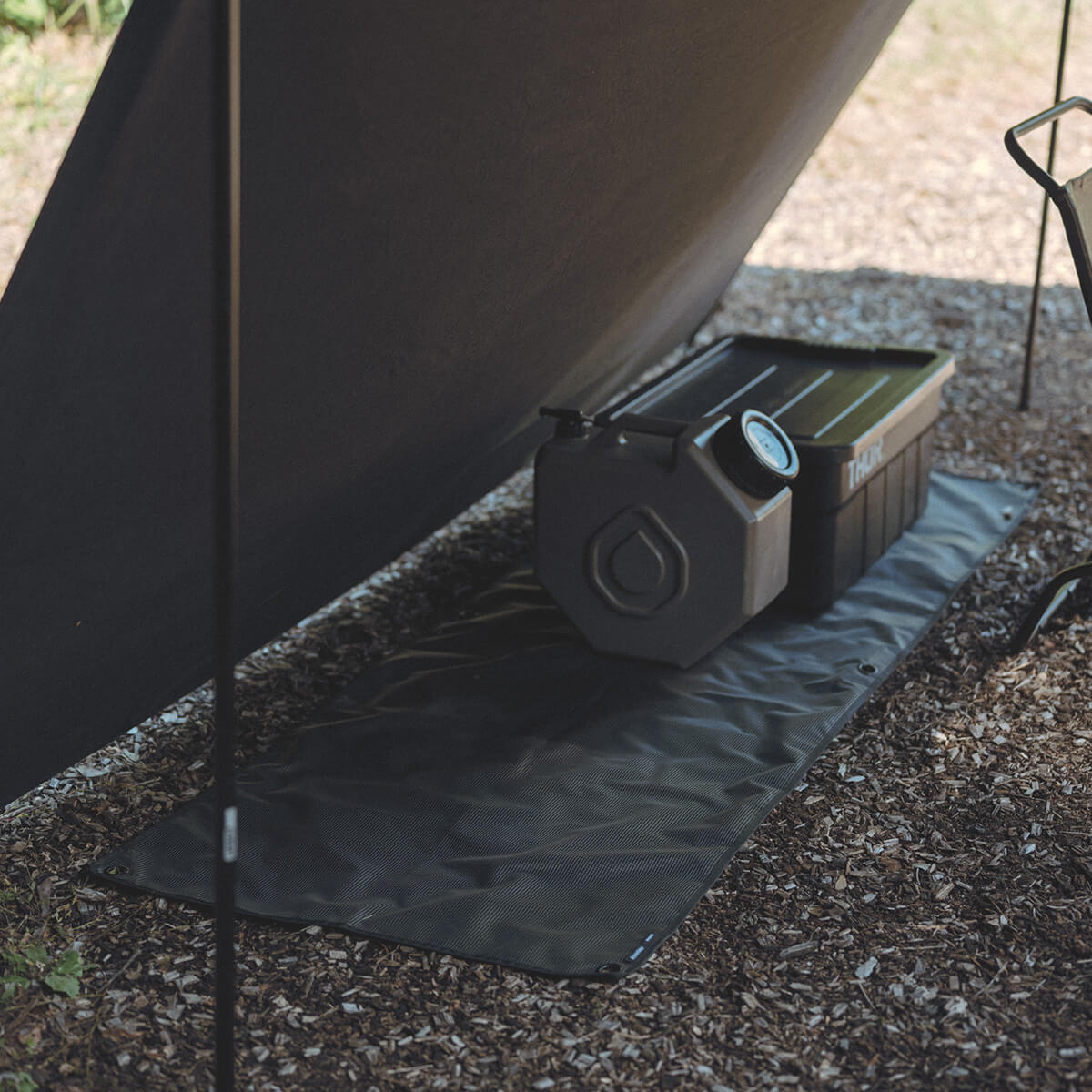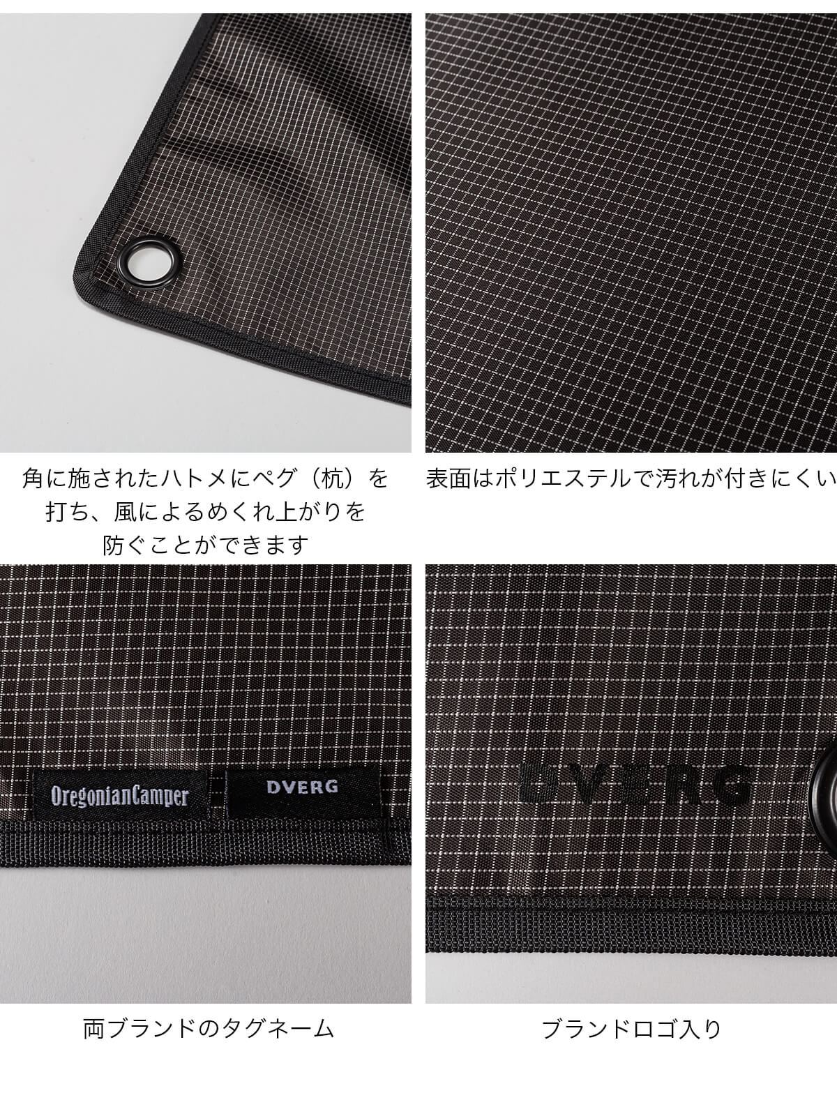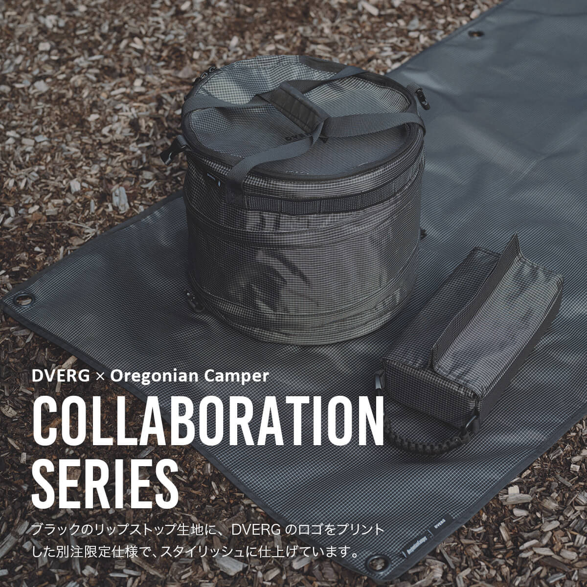 ブラックのリップストップ生地に、DVERGのロゴをプリントした別注限定仕様で、スタイリッシュに仕上げています。キャンプでは荷物置き場として、車内では傷・汚れ防止として使いやすい形とサイズ感です。