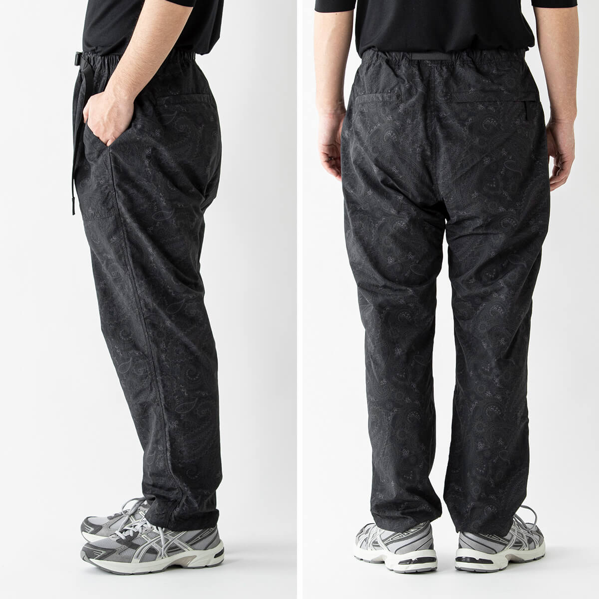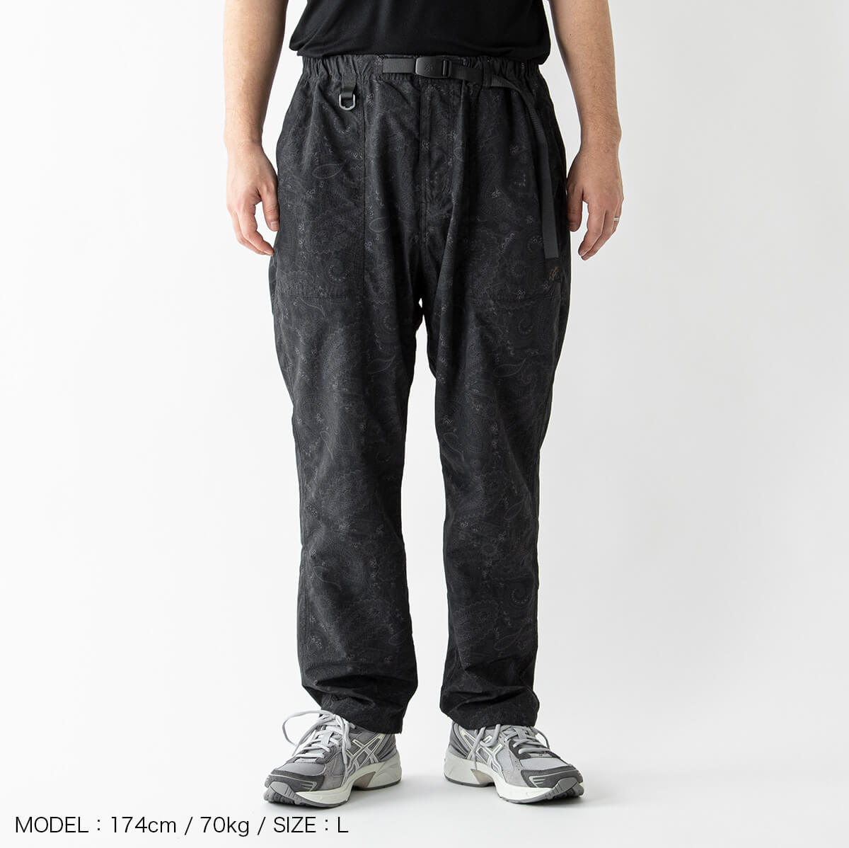 膝から裾にかけて徐々に細くなるルーズシルエットのパンツを、さらにワイドにアレンジ。腰回りにはDカンを配置、垂れ下がるベルト部分を5cm延長することで、デザインにアクセントを加えている。