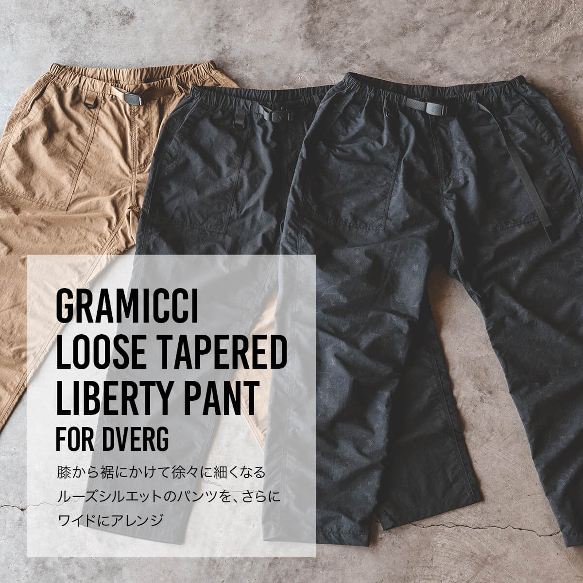 GRAMICCIの定番アイテム「LOOSE TAPERED RIDGE PANT」を、ナイロン素材とシルエットでDVERGが別注。