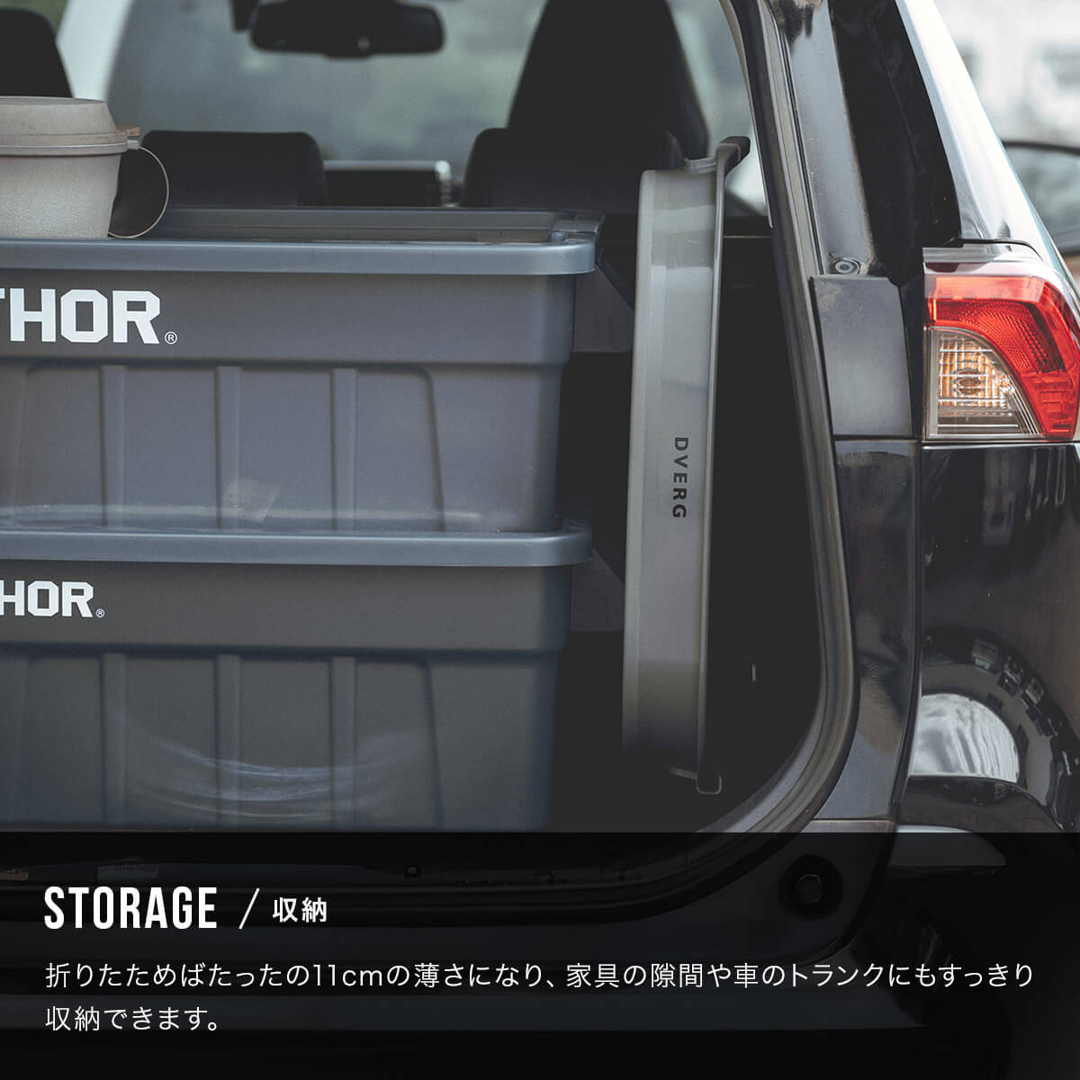 折りたためばたったの11cmの薄さになり、家具の隙間や車のトランクにもすっきり収納できます。底面には滑り止めが付いており、滑りやすい場所でも安定して使用できます。