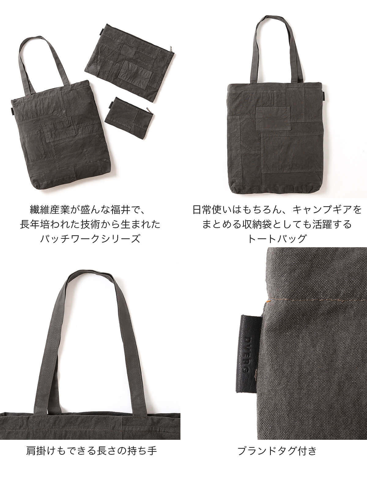※人気商品の為、お一人様1個までに購入制限させていただきます。※在庫連動システムの関係上、まれに完売商品についても在庫ありと表示されて購入可能な場合がございます。 該当のお客様には別途ご連絡いたしますのでご容赦賜りますようお願い致します。 ドベルグ PATCHWORK TOTE DVERG トートバッグ 鞄 パッチワーク 福井 日本産 おしゃれ キャンプ アウトドア