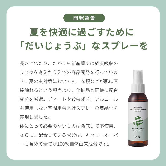 「あなたとあなたの一番大切な人に、心からだいじょうぶと思えるものを」のコンセプトのもと商品開発を行うブランド「だいじょうぶなもの」より、この度、自然由来成分100%の虫よけスプレーを発売。夏の虫が気になる一方で、殺虫成分などの配合成分が気になってスプレー類は苦手という方や、肌への刺激が気になる方にもおすすめです。