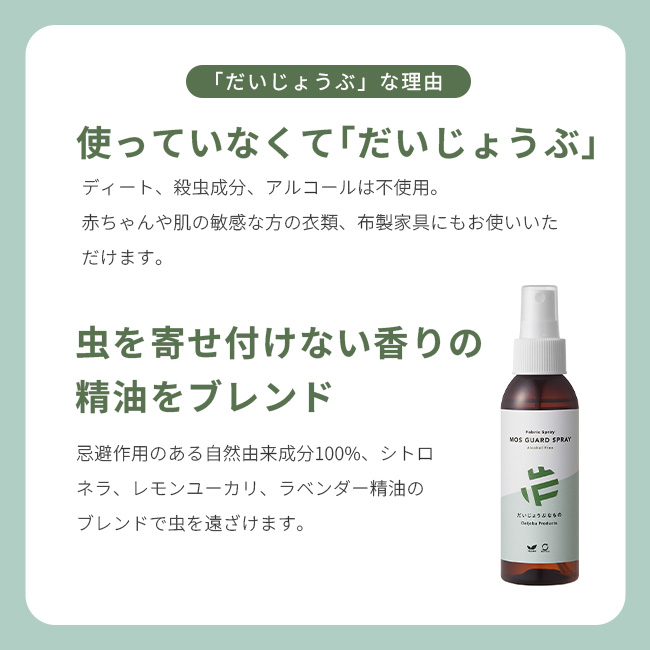 だいじょうぶなもの モスガードファブリックスプレー100ml OPF00059 made of Organics 虫よけ 夏 アロマスプレー ファブリックスプレー オーガニック成分 天然成分 ハーブ フレッシュ 寝具 衣料 ギフト プレゼント 贈り物 母の日 ガーデニング フェス キャンプ アウトドア