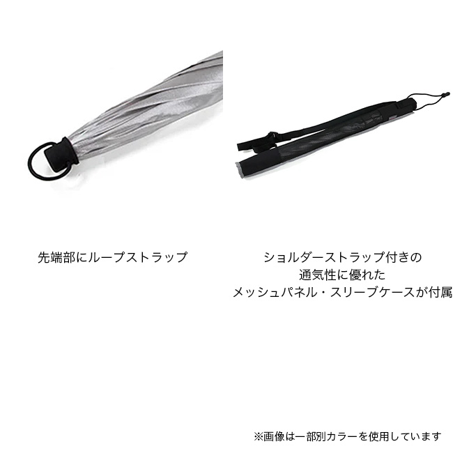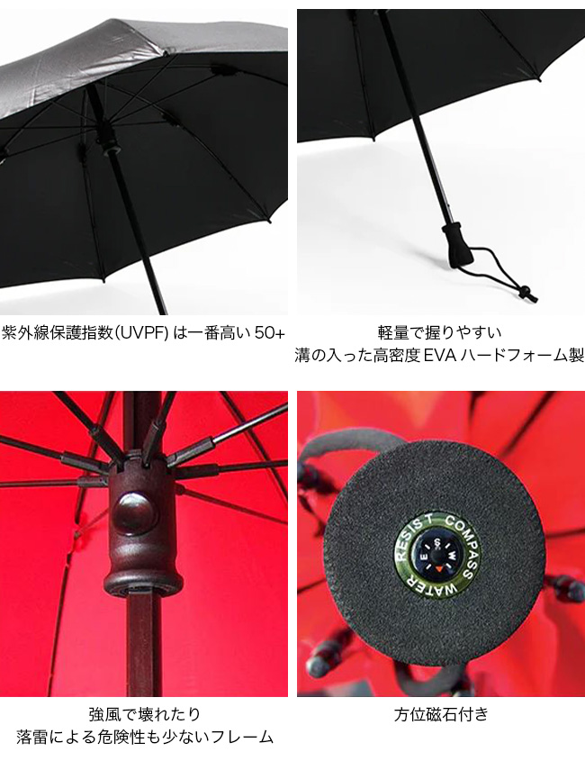 グローブを着用したままでも持ちやすく、突然の強風でも傘が飛ばされないようにエンド部にセーフティランナー付きで、野外で便利な方位磁石もグリップエンドに装着されています。