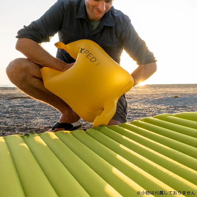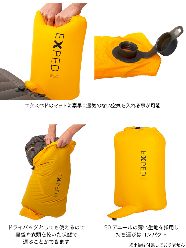 エクスペドマットに湿気のない迅速な空気封入を保証させ、防水性のある圧縮ドライバッグとしても機能し、寝袋や衣類を乾いた状態に保ちます。ポンプ内蔵のEXPEDマットにも接続できます。