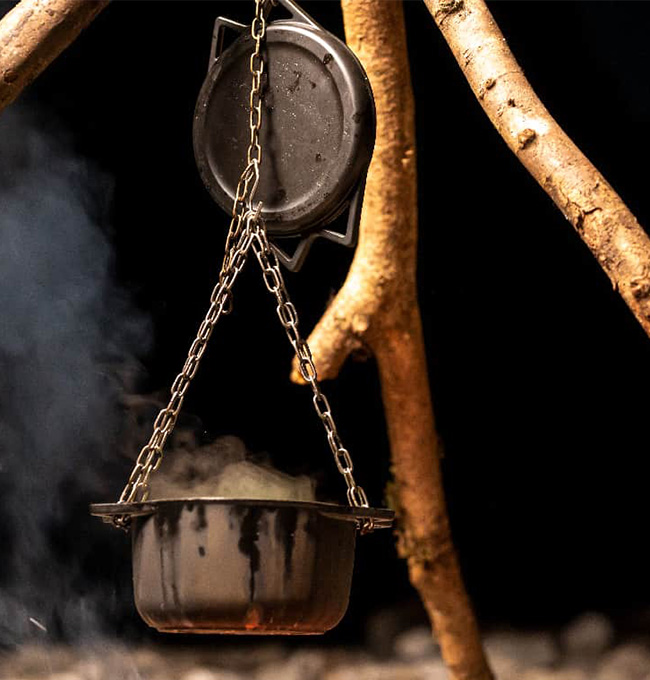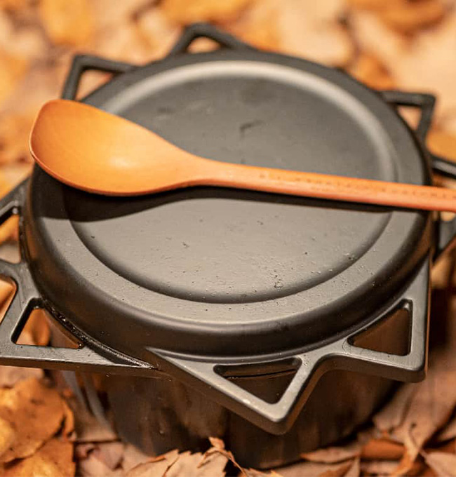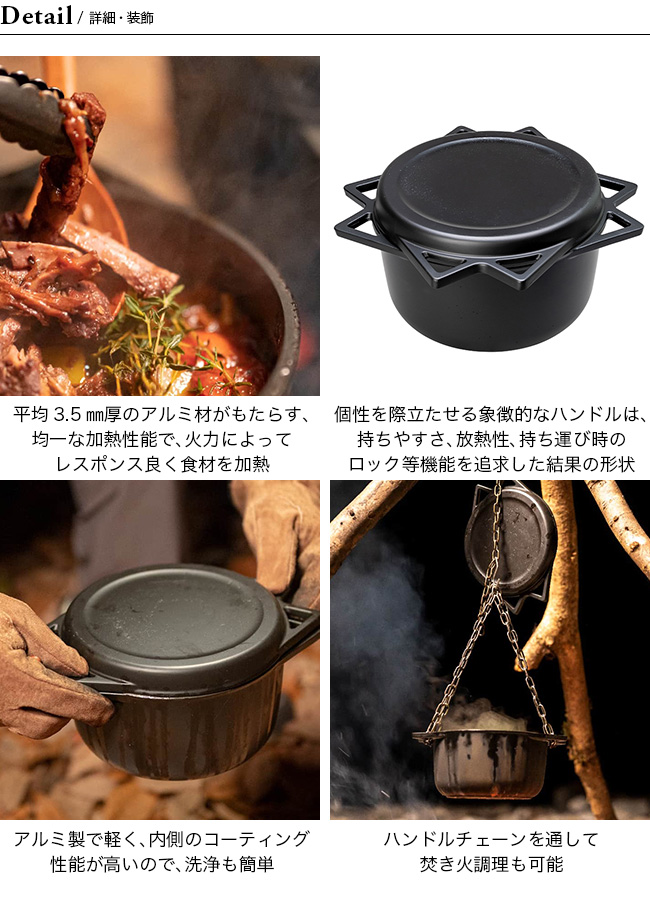 汁物・ご飯を炊きやすい深めの作り対焚火仕様のコーティングとハンドル1300mlのTi POtがスッポリと入る径等々、その佇まい、醸し出す雰囲気は家のキッチンでも抜群に映えます。