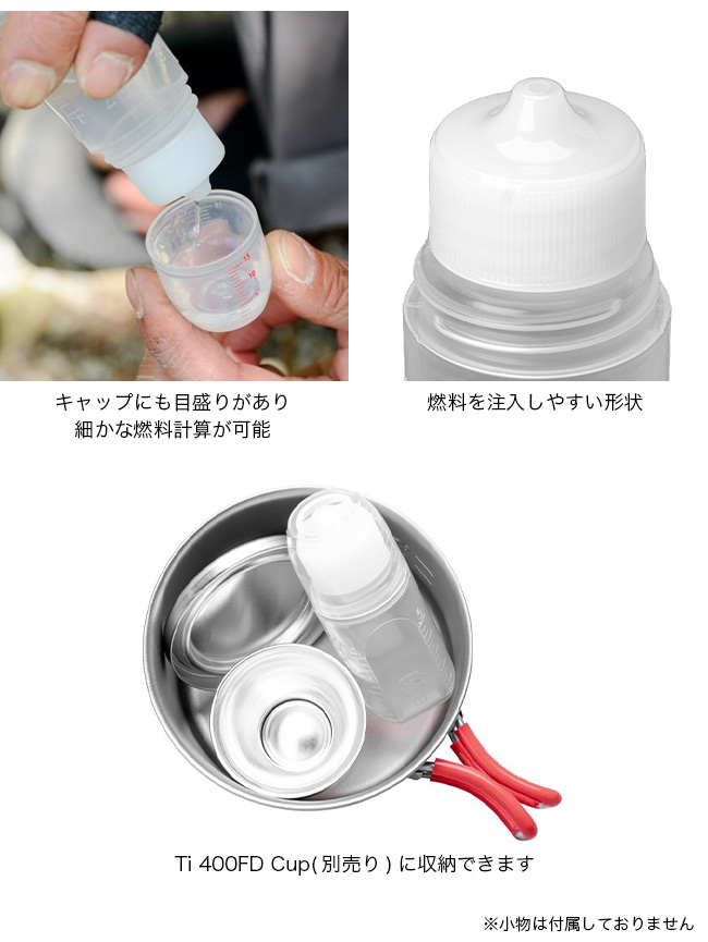 キャップが計量カップを兼ねており細かな燃料計算が可能。カップ麺2杯分の燃料が運搬可能です。