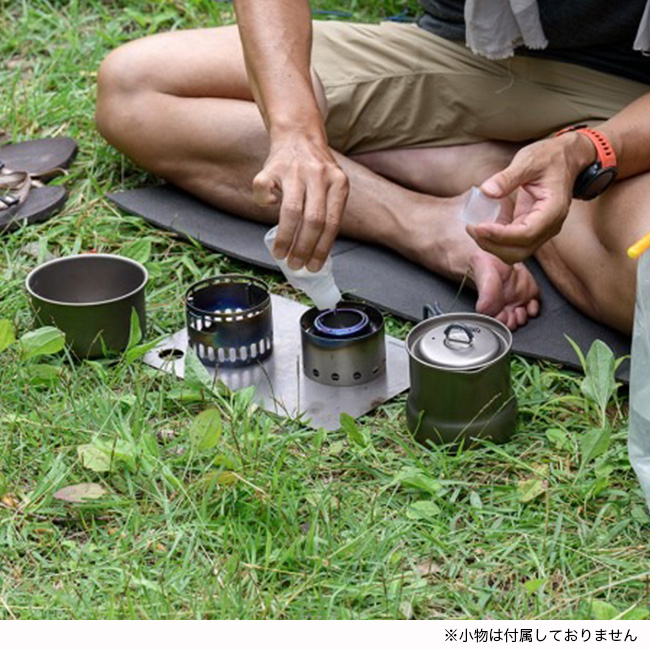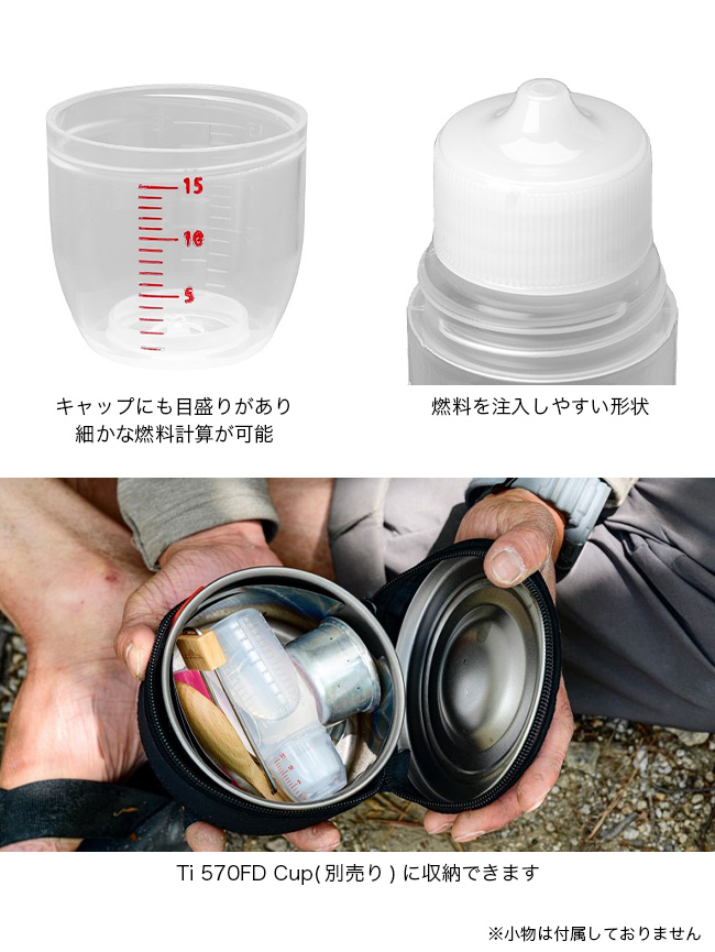 キャップが計量カップを兼ねており細かな燃料計算が可能。「Ti 570FD Cup」に「BLUENOTE stove」+「Pre-Heating Plate」+「Ti9G Windshield」+ライターがALL IN ONEで収納可。