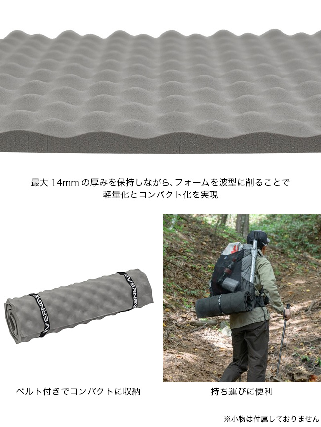 最大14mmの厚みを保持しながら、フォームを波型に削ることで軽量化とコンパクト化を実現。Trail matと同様の適度な硬さを備え、肩からお尻までをカバーする全長100cmは、必要最低限の長さで荷物を増やさず快適な休息を提供します。
