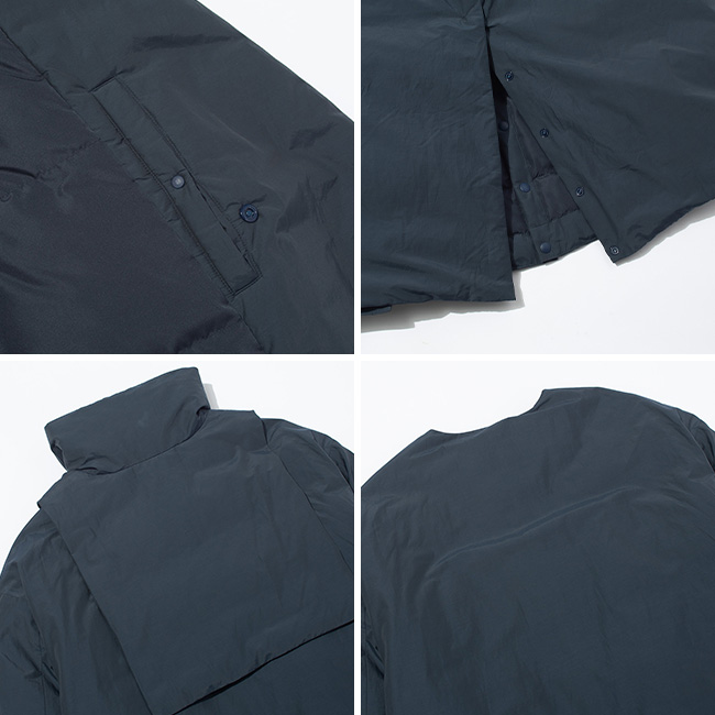 ジャケットや寝袋、布団から回収した羽毛を丁寧に再洗浄し、650フィルパワーのダウンとして再利用。表地にはリサイクルナイロンとオーガニックコットンを高密度に織り上げたマットな素材を使用し、軽やかな着心地と落ち着いた表情を両立しました。