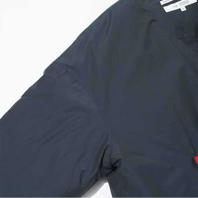 リサイクルナイロンは、タテ糸にリサイクルナイロン糸、ヨコ糸にオーガニックコットン糸を使用し、高密度に織ることで、マットな仕上がりになっています。また、後加工でダウンプルーフ加工も施されています