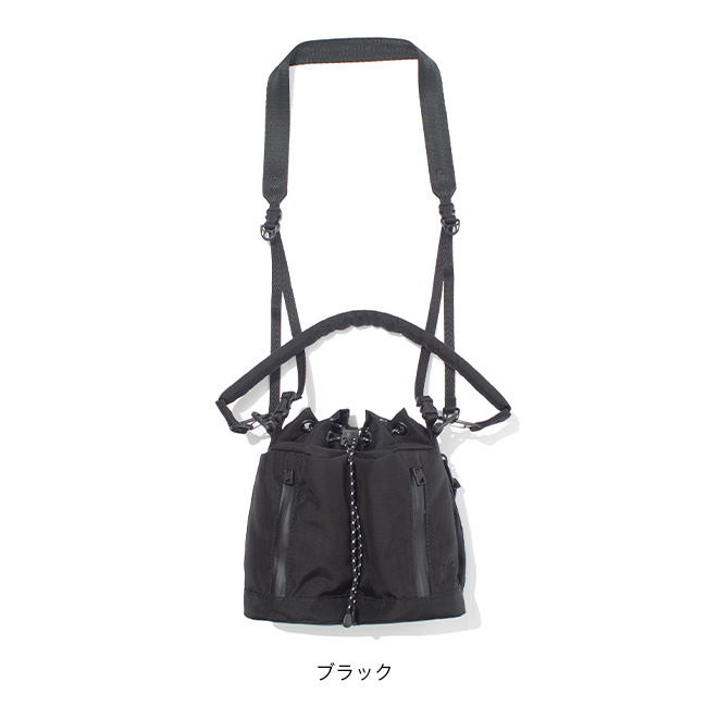 ハンドストラップと着脱可能なショルダーストラップが付属しており、2way仕様で手持ち・肩掛けどちらでも使える実用的なアイテムです。ドローコードを絞った状態でも、横ジッパーから中身へスムーズにアクセスできる設計で、日常使いに高い利便性を発揮します。