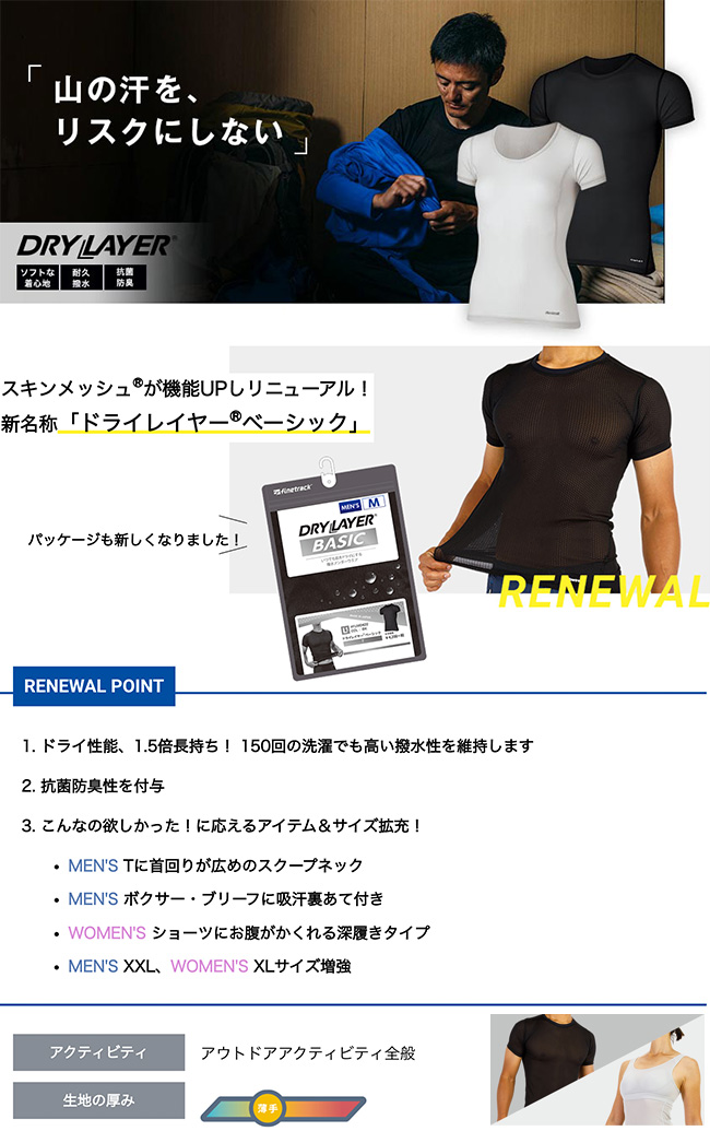 ※本商品(ドライレイヤー®ベーシック)は、軽さと機能を両立させるために繊細なニット生地を採用しています。繰り返しの摩擦や面ファスナー、枝などの引っかけ、硬い物との接触により、生地に損傷が生じる恐れがあります。また、ニット生地は繰り返しの使用や洗濯によって縮みやすい特性があり、特にタンブラー乾燥は大幅な縮みが発生するので絶対に避けて下さい。